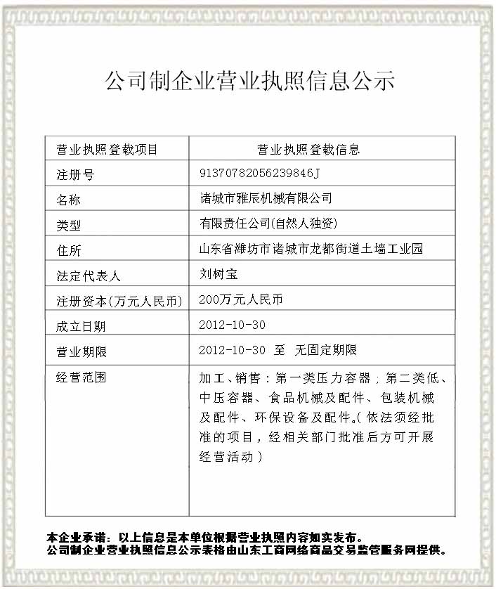諸城市雅辰機(jī)械有限公司具有壓力容器(證書(shū)編號(hào):TS2237E79-2028)制造資質(zhì),主要生產(chǎn)制造各種夾層鍋、蒸煮鍋、鹵鍋、殺菌鍋、行星炒鍋、松香鍋、攪拌罐、食用菌滅菌罐、硫化罐等,是食品加工設(shè)備制造商。產(chǎn)品設(shè)備銷(xiāo)往全國(guó)多個(gè)省市、自治區(qū)及出口東南亞、中亞等多個(gè)地區(qū)。 雅辰夾層鍋有電加熱夾層鍋、蒸汽夾層鍋、燃?xì)鈯A層鍋、電磁加熱夾層鍋、帶攪拌夾層鍋、立式夾層鍋、可傾斜夾層鍋等。殺菌鍋有電加熱殺菌鍋、蒸汽殺菌鍋、電汽兩用殺菌鍋、臥式、立式、雙層殺菌鍋、雙鍋并聯(lián)殺菌鍋、多鍋串聯(lián)等品種。 公司一貫堅(jiān)持客戶(hù)為上的經(jīng)營(yíng)理念,一切為客戶(hù)著想。在產(chǎn)品的售前、售中、售后各方面為客戶(hù)提供滿(mǎn)意的設(shè)計(jì)研發(fā)、生產(chǎn)制造、售后服務(wù)體系。