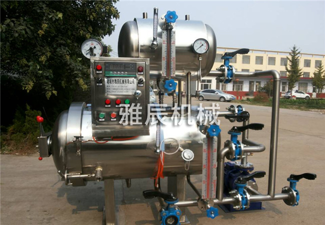 臥式殺菌鍋用蒸汽作介質(zhì)進(jìn)行殺菌的特點(diǎn)是升溫降溫迅速,鍋內(nèi)溫度分布均勻,因此較適用用于罐型不太大的金屬罐頭的反壓殺菌